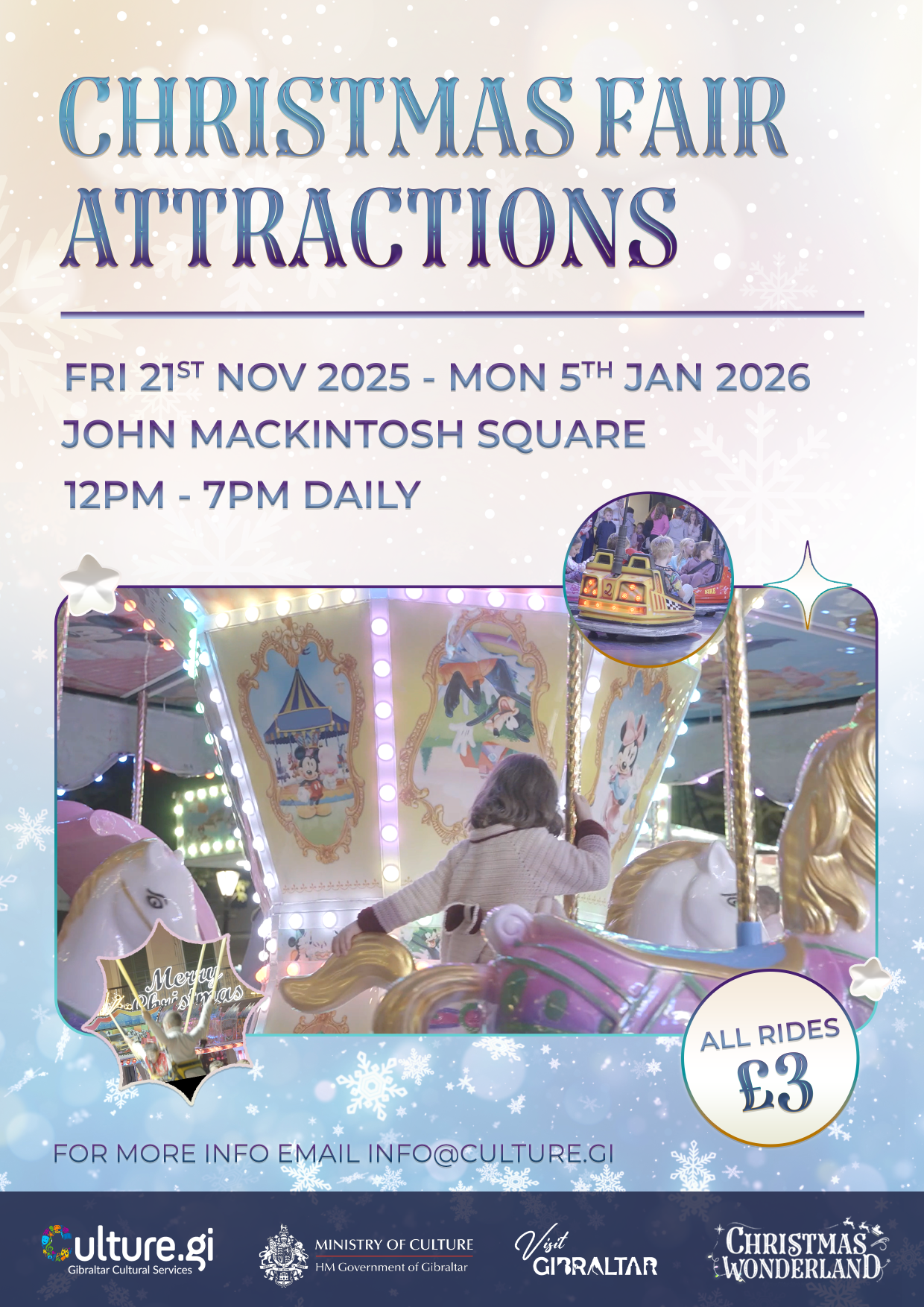 Gibraltar Cultural Services (GCS), on behalf of the Ministry of Culture, is pleased to announce that the Christmas Fair attractions, particularly popular amongst the young members of our community, will once again feature throughout the festive Christmas period.