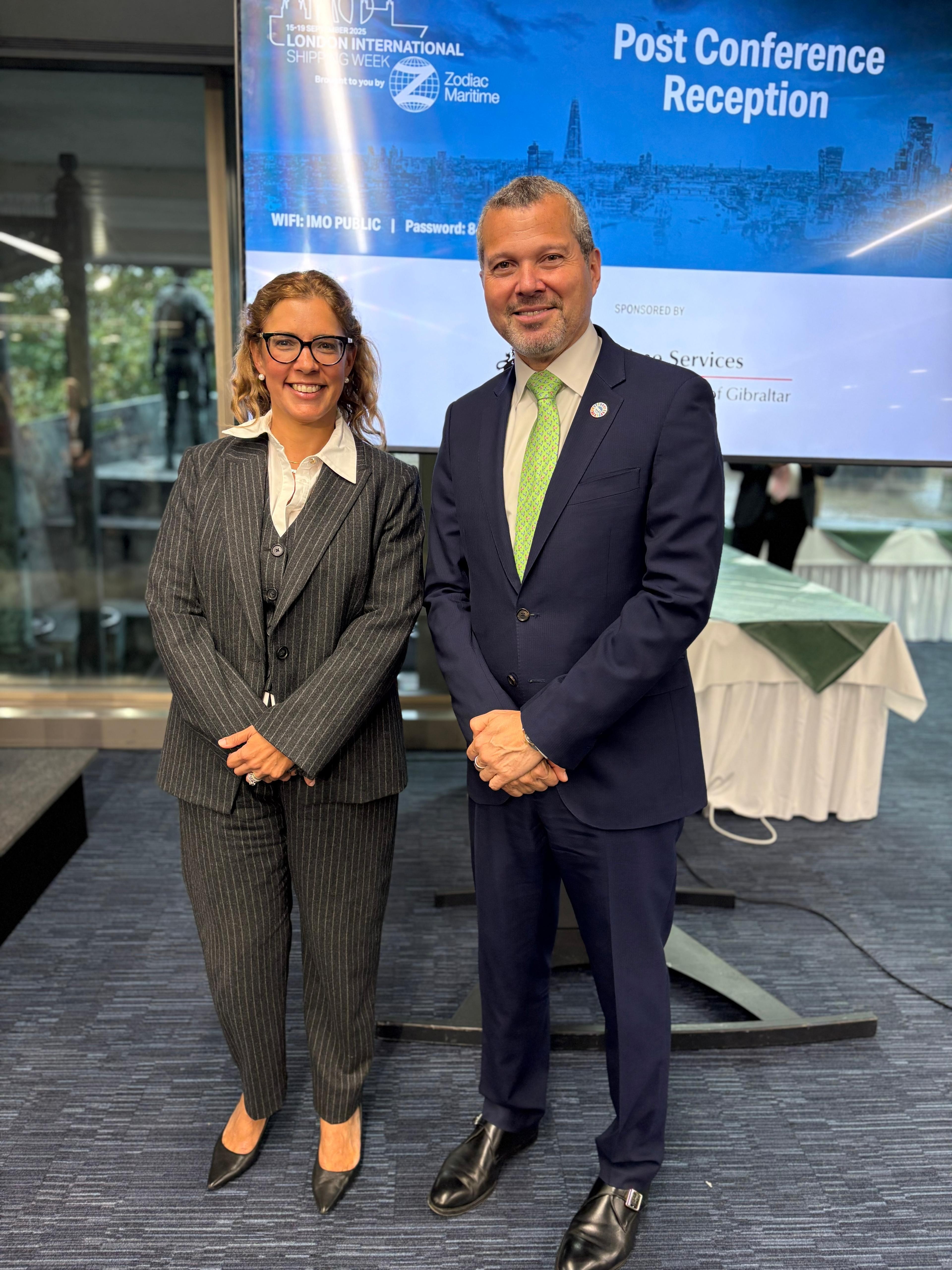 As part of the wider programme, Minister Arias-Vasquez addressed an audience of over 500 attendees at the post-conference reception hosted by the Government of Gibraltar. In her address, the Minister emphasised Gibraltar’s unique strategic location and reaffirmed Gibraltar’s clear message to the international maritime community: we are open for business. During the event, the Minister also held discussions with the Secretary-General of the International Maritime Organisation, Arsenio Antonio Domínguez Velasco, who delivered his own keynote remarks.