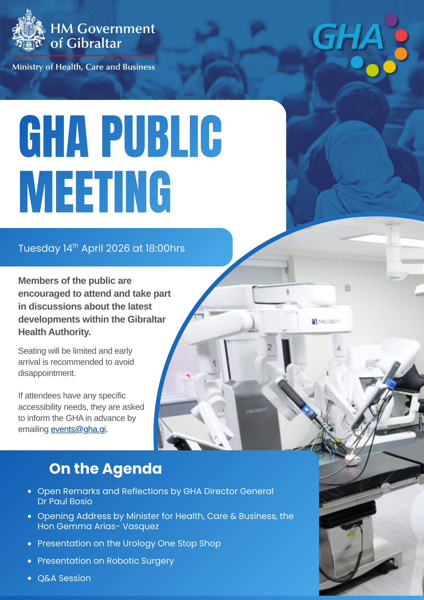 The Minister for Health, Care and Business, the Hon Gemma Arias-Vasquez, is pleased to announce that the next GHA Public Meeting will take place on Tuesday 14th April 2026, at 18:00hrs at the Charles Hunt Room.