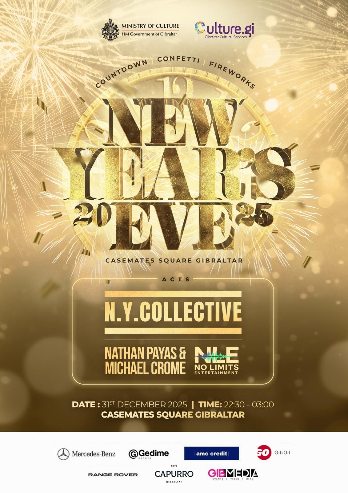 Gibraltar Cultural Services (GCS), on behalf of the Ministry of Culture, is pleased to announce the programme of events for this year’s New Year’s Eve Celebrations organised by GibMedia. We will bring in the New Year as expected on Wednesday 31st December 2025 at Casemates Square from 10:30pm to 3am on Thursday 1st January 2026.