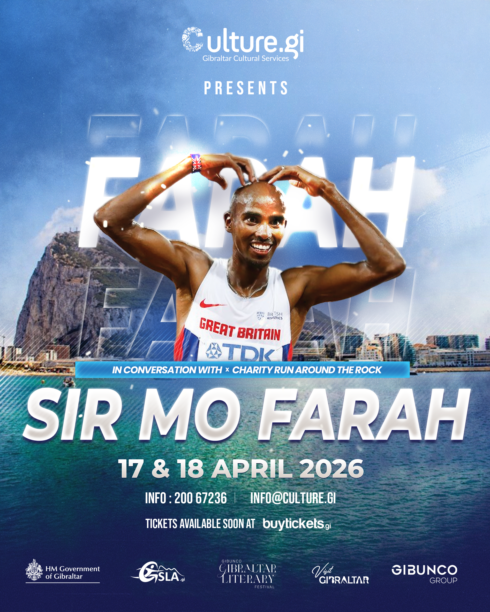 Gibraltar Cultural Services, on behalf of the Ministries for Tourism and Culture, is delighted to announce Sir Mo Farah will be coming to Gibraltar in April 2026 as part of a prelude event to the 2026 Gibunco Gibraltar Literary Festival.