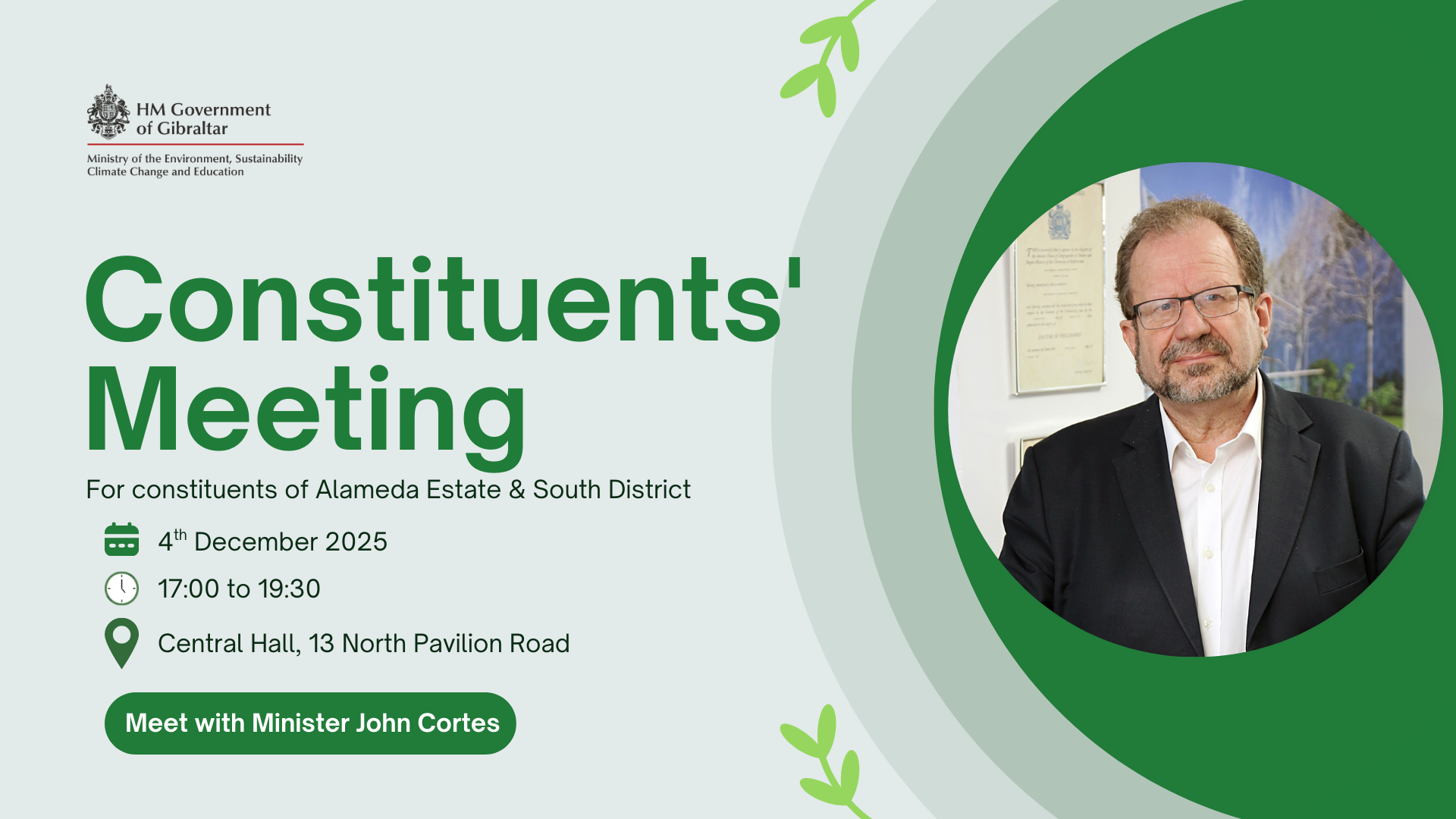 The Minister for the South District Constituency, Professor John Cortes, will be holding a further ‘Town Hall’ style meeting for the constituency on Thursday 4th December 2025.