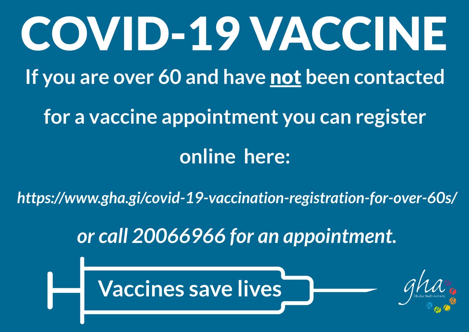 The GHA has now contacted most individuals over the age of 60. If anyone over the age of 60 who has not yet been invited for vaccination and who has not previously registered with the GHA online database, they are encouraged to do so using the online form at https://www.gha.gi/covid-19-vaccination-registration-for-over-60s/ or contact 20066966 for an appointment.