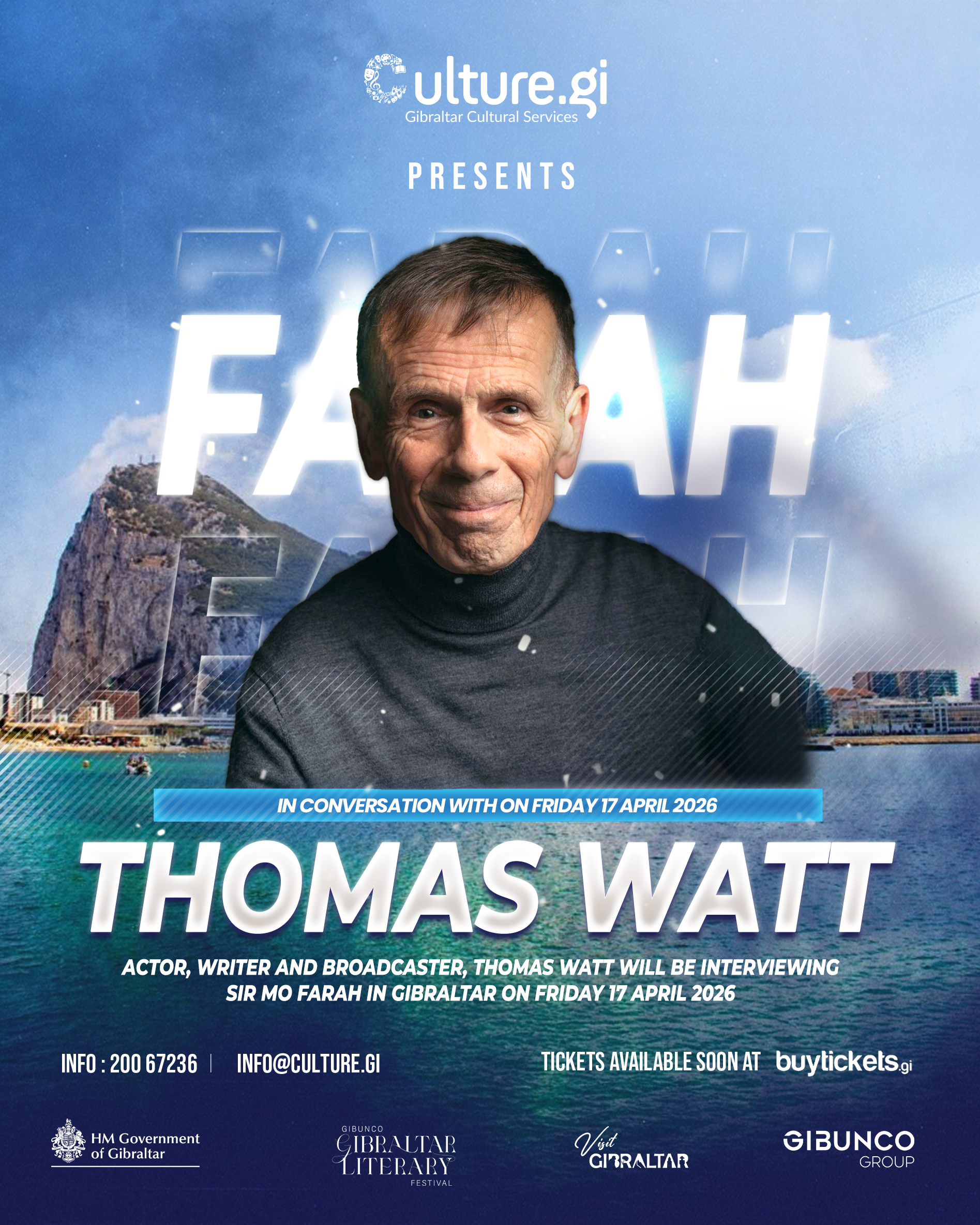 Gibraltar Cultural Services, on behalf of the Ministries for Tourism and Culture, can confirm that Thomas Watt will be interviewing Sir Mo Farah next month on the 17th April 2026 as part of a prelude event to the 2026 Gibunco Gibraltar Literary Festival.