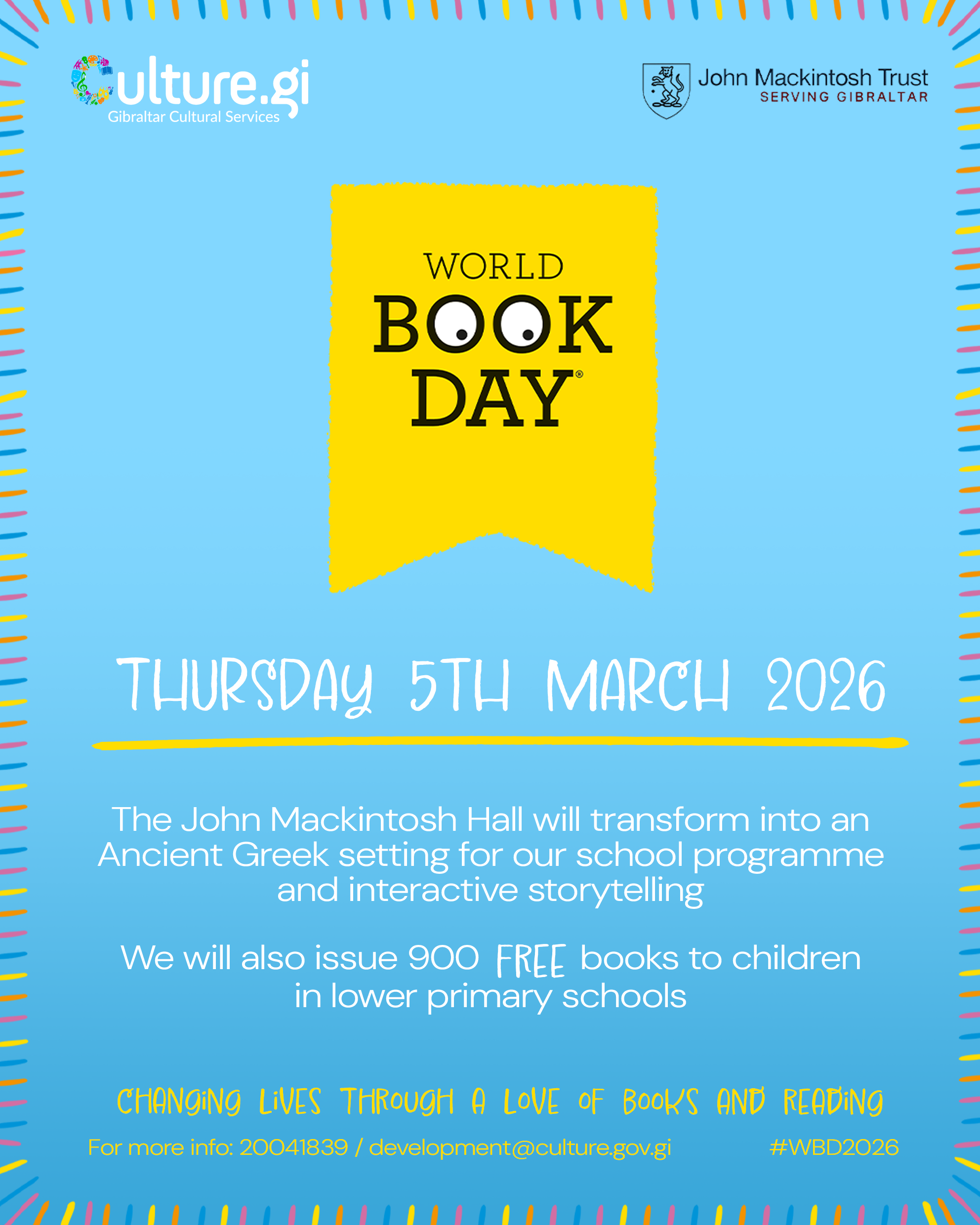 Gibraltar Cultural Services (GCS), on behalf of the Ministry for Culture, is once again looking ahead to World Book Day events, which is kindly being sponsored by the John Mackintosh Hall Trust.
