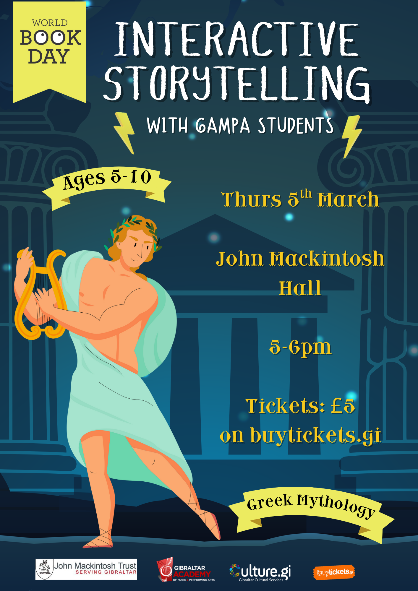 A public interactive storytelling session will take place in the Hall after school hours, designed for children aged 5 to 8 and presented by GAMPA Juniors. The session will be based on Greek Myths. Families are warmly invited to join us in a cosy setting where children can immerse themselves in the magic of storytelling. Children are welcome to come in fancy dress should they wish. Tickets are priced at £5 per child, accompanying adults and babies in arms go free. These are available on www.Buytickets.gi