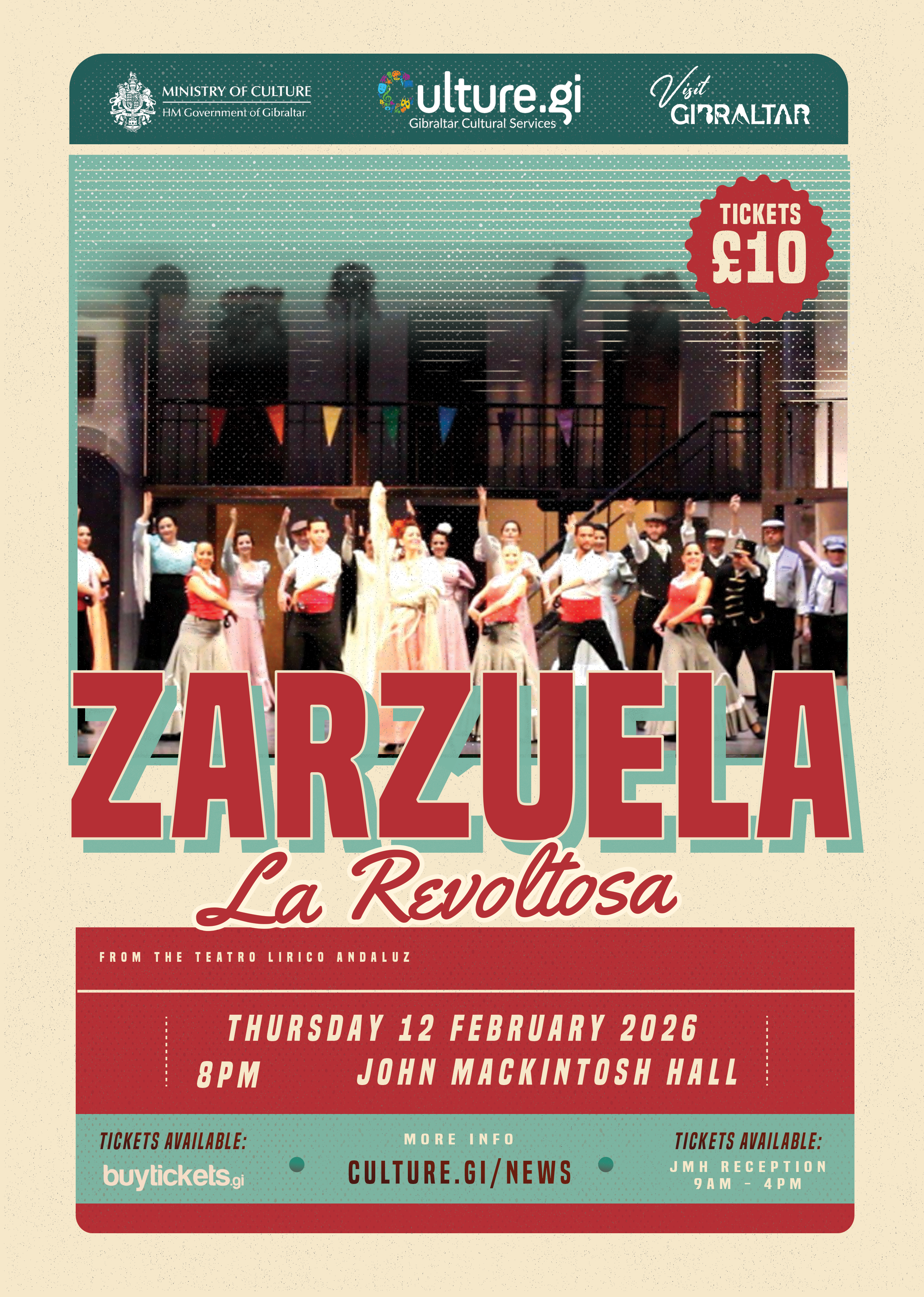 The Teatro Lirico Andaluz will perform ‘La Revoltosa’. The performance will be held at the John Mackintosh Hall Theatre on Thursday 12th February 2026 at 8pm. Tickets priced at £10 are on sale via www.buytickets.gi or from the John Mackintosh Hall reception between 9am and 4pm.